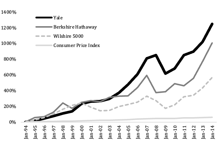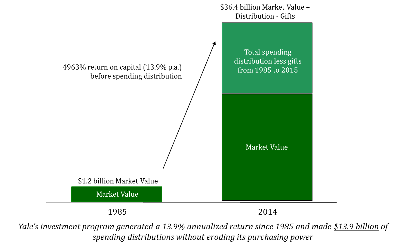 Taking his degree, Swensen spent six years first at Salomon Brothers then at Lehman Brothers—eventually being promoted to Senior Vice President. One of his career notables on the sell-side was his role engineering the first swap transaction between IBM and the World Bank that allowed the technology company to hedge its currency risk to Germany and Switzerland. Throughout this time, Swensen kept close to his alma-mater—teaching an undergraduate course one evening a week. Eventually the call back to Yale won out and instead of pursuing a much more lucrative career at a hedge fund, Swensen returned to his alma mater full-time and joined Yale’s investment office in 1985 at the age of 31. Despite the 80% pay-cut, Swensen was still concerned about his own qualifications to run the fund[3]. Nonetheless 30 years later, in turned out that he had no reason to be concerned about his abilities.