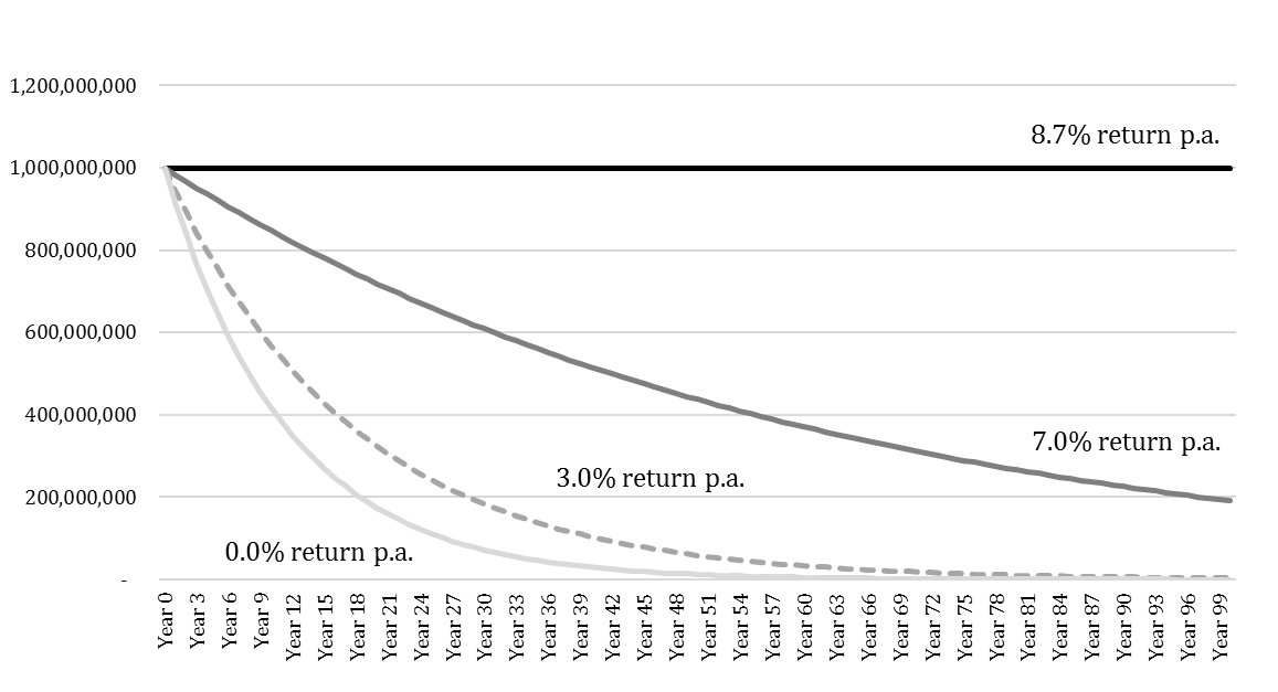 Benefactors of foundations should aim to create philanthropic foundations that can provide sustainable and altruistic services that will continue throughout ages. Looking at past performance, over a three-year period, all U.S. foundations must donate an annual average of 5% of their foundation assets in order to maintain their tax-exempt statuses. Thus to fulfill their philanthropic and legal goals, foundations must generate sufficient income to sustain their “giving” power. After taking into account the 50-year average annual inflation rate of 3.7%, to maintain the same impact from Year 1 to Year 100, the investment portfolio must generate 8.7% annualized returns. This is not necessarily an easy feat for long-term purchasing power preservation.