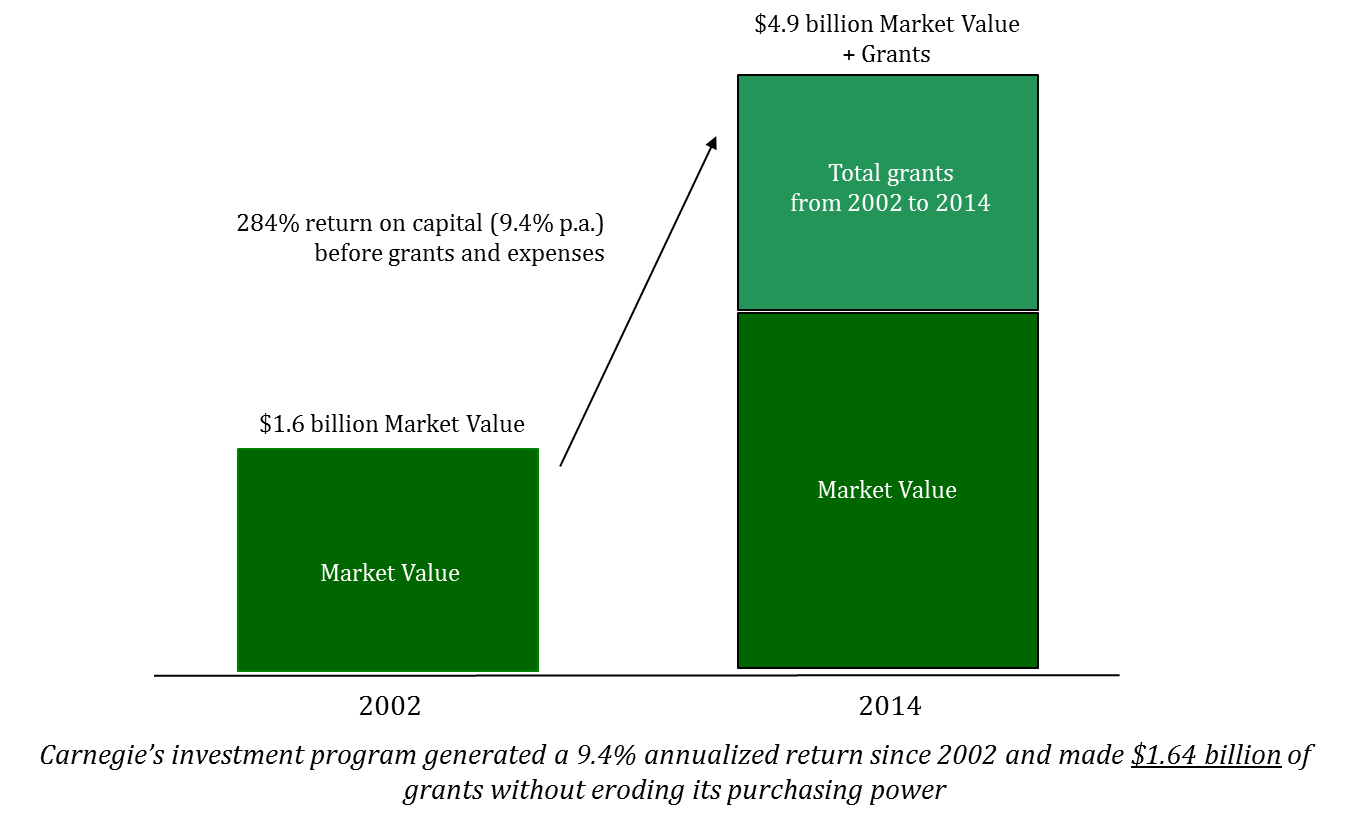 An appropriate organizational structure and investment management program are critical to the long-term survival of a philanthropic entity. From 2002 to 2014 Carnegie generated an annualized return of 9.4% and made $1.64 billion of grants without impeding its purchasing power. For lasting impact, foundations must adopt a sophisticated investment program with a diversified portfolio, including alternative investments managed by external managers.